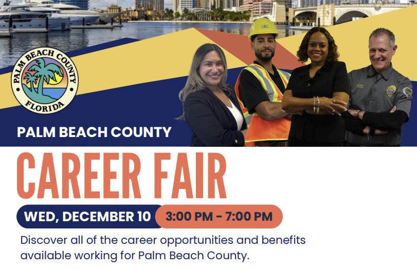 For anyone looking for jobs, the Palm Beach County Career Fair will be held Wednesday, December 10, from 3:00 pm - 7:00 pm at the Majestic Ballroom in the Hilton Hotel located at 130 Australian Ave, West Palm Beach. The Fair focuses on available jobs in Palm Beach County. Go to pbc.gov for more info.