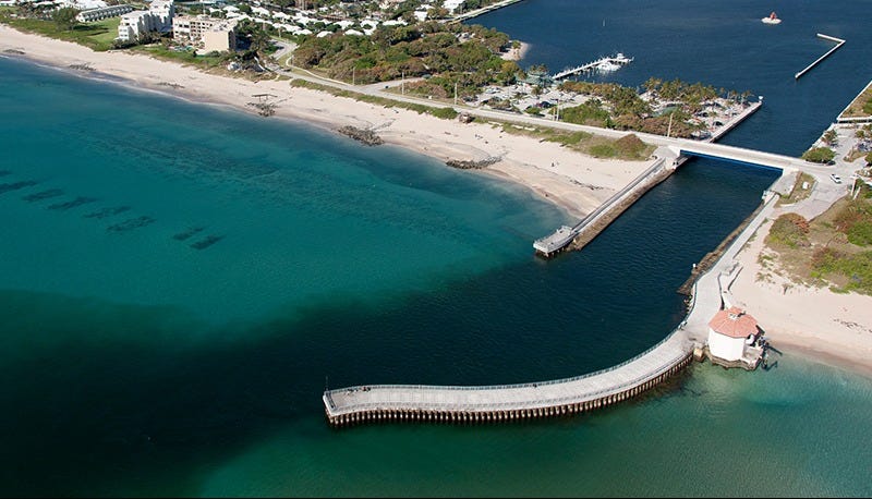 The Boynton Inlet is one of South Florida’s most popular diving and boating access points, linking to coral reefs, wrecks, and drift-diving sites. Construction on the Inlet began in September 1923 and was completed in 1927.