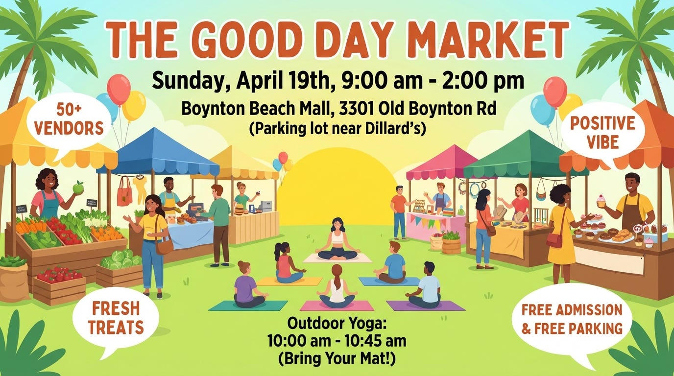 The Good Day Market will be back at the Boynton Beach Mall on Sunday, April 19th, from 9:00 am - 2:00 pm. Located at 3301 Old Boynton Rd in the parking lot near Dillard’s, this curated market offers a taste of everything. There will be an outdoor yoga session from 10:00 am to 10:45 am to help start your day off the right way, so bring your mat! Enjoy 50+ vendors, fresh and delicious treats, artisan crafts items, and a positive vibe at this twice-monthly event. It’s FREE and so is parking. For more details visit The Good Day Market Facebook page.