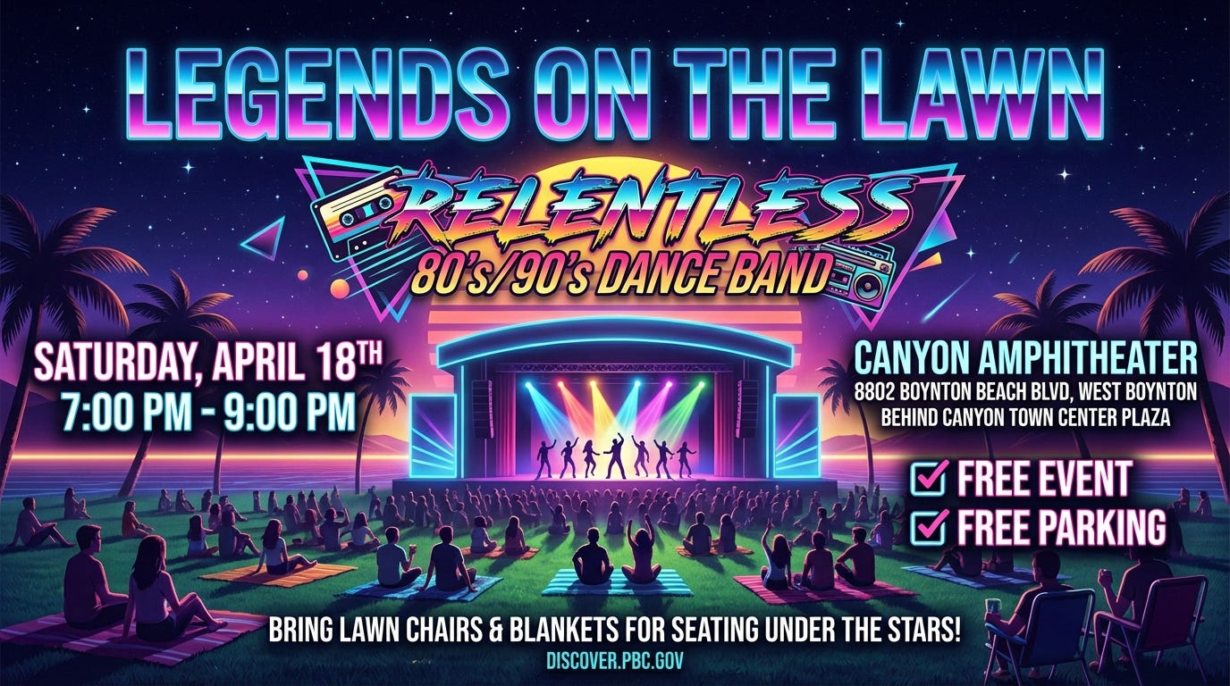 On Saturday, April 18th, Legends on the Lawn will be back at the Canyon Ampitheater from 7:00 pm - 9:00 pm. The venue will come alive with Relentless, a 80’s/90’s dance band that is sure to please! The Canyon Ampitheater is located in West Boynton at 8802 Boynton Beach Blvd, behind the Canyon Town Center plaza. This is a FREE event and a great way to enjoy an outdoor evening under the stars listening to the retro beats. Lawn chairs and blankets for seating are encouraged. Parking is FREE too. Go to discover.pbc.gov for more info.