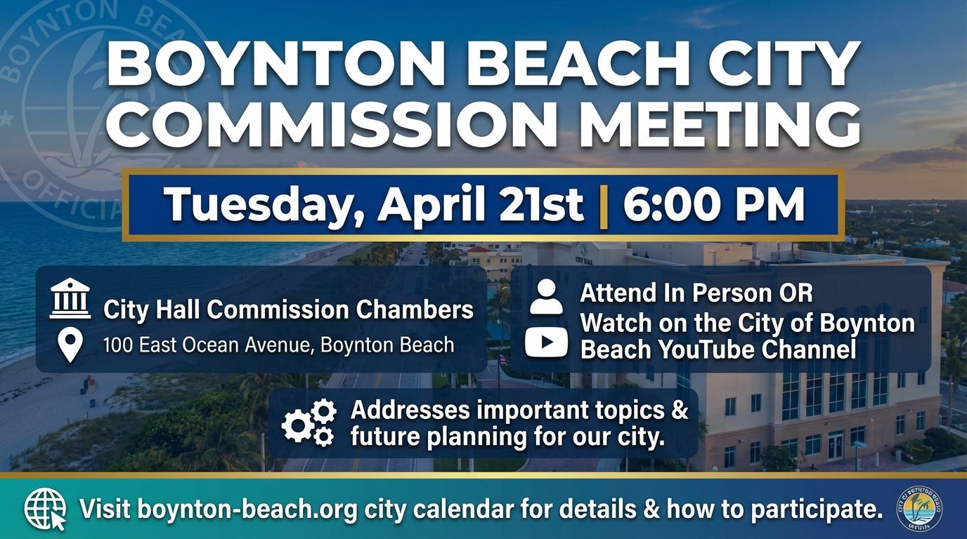 There will be a Boynton Beach City Commission Meeting on Tuesday, April 21st at 6:00 pm. It will be held at the City Hall Commission Chambers located at 100 East Ocean Avenue in Boynton Beach. Residents can attend in person or visit the City of Boynton Beach YouTube Channel. The meeting addresses topics that are currently important to our city as well as planning for the future. Go to the boynton-beach.org city calendar for more details and for the info on how to participate.