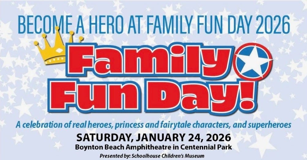 The Children’s Schoolhouse Museum Family Fun Day will be held on Saturday, January 24th, at Centennial Park & Ampitheater. Located at 120 East Ocean Blvd, in Boynton Beach, this FREE family-friendly event will run from 10:00 am-2:00 pm. There will be a parade, kids’ activities, interactive experiences, a meet-and-greet with local community heroes, and much more. Costumes are encouraged so come dressed to impress. For more information go to schoolhousemuseum.org.
