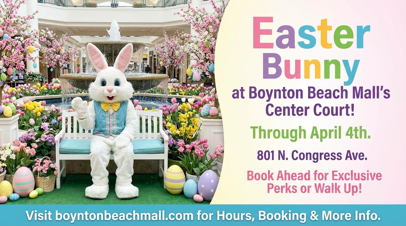 Easter is just around the corner! The Easter Bunny is visiting Boynton Beach Mall's Center Court by the fountain through April 4th, located at 801 N. Congress Ave. Book ahead for exclusive perks, or simply walk up at your convenience. Don't miss the chance to snap a magical holiday photo! Hours vary by day, so visit boyntonbeachmall.com for scheduling, booking, and more information.