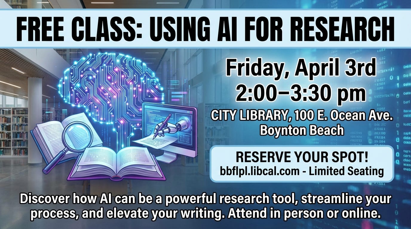 Reserve your spot for a FREE class - Using AI For Research - on Friday, April 3rd from 2:00 pm – 3:30 pm at the City Library, 100 E. Ocean Ave. in downtown Boynton Beach. Discover how AI can be a powerful research tool, streamline your process, and even elevate your writing. Attend in person or online. Just be sure to register at bbflpl.libcal.com, as seating is limited.