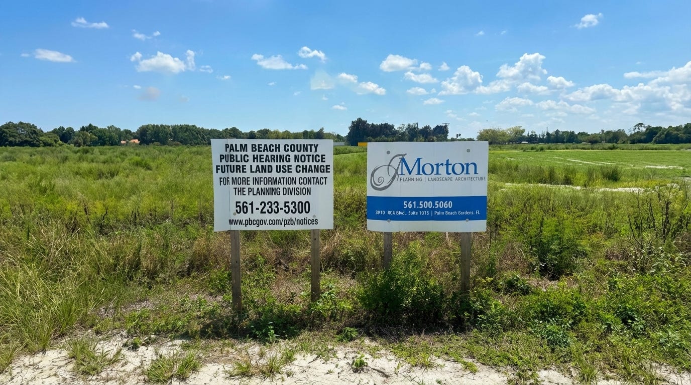 A quiet land battle is brewing in western Boynton Beach. It’s one that most residents don’t even know exists. Since 2021, West Boynton Ranches Holdings LP has been steadily and strategically assembling nearly 180 acres inside the Agricultural Reserve along Boynton Beach Blvd, and their next move may be imminent. A vacant 30-acre tract which was once an equestrian property and farmland is the anchor site for a proposed multi-family development. It was rejected by the county in April 2025, then vanished from the agenda entirely. Recently planted rezoning and architectural signs along the boulevard suggest the project is quietly coming back to life.