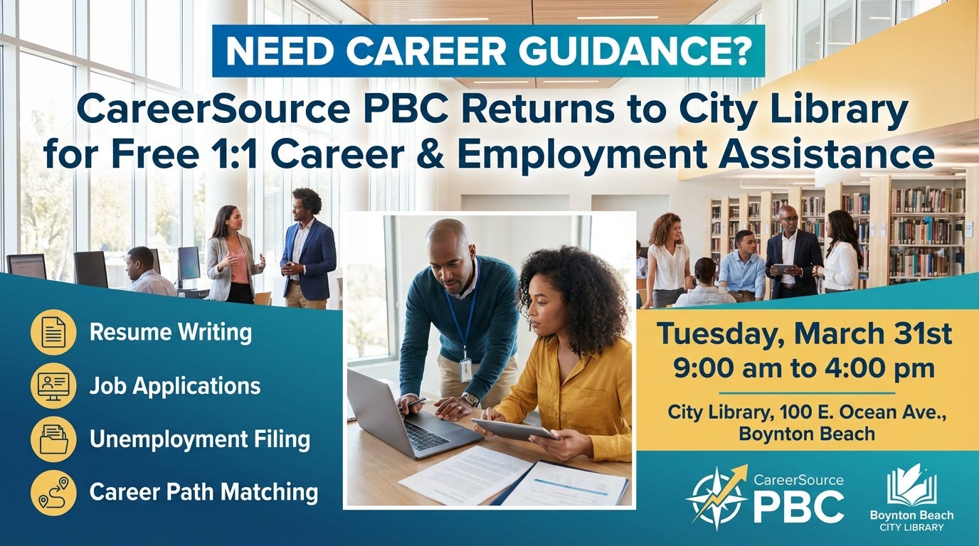 Need career guidance? On Tuesday, March 31st, CareerSource PBC returns to the City Library, 100 E. Ocean Ave. in Boynton Beach, for FREE 1:1 Career and Employment Assistance from 9:00 am - 4:00 pm. Mentors will offer personalized support on resume writing, job applications, unemployment filing, and career path matching. For more information, visit the city calendar at boynton-beach.org.