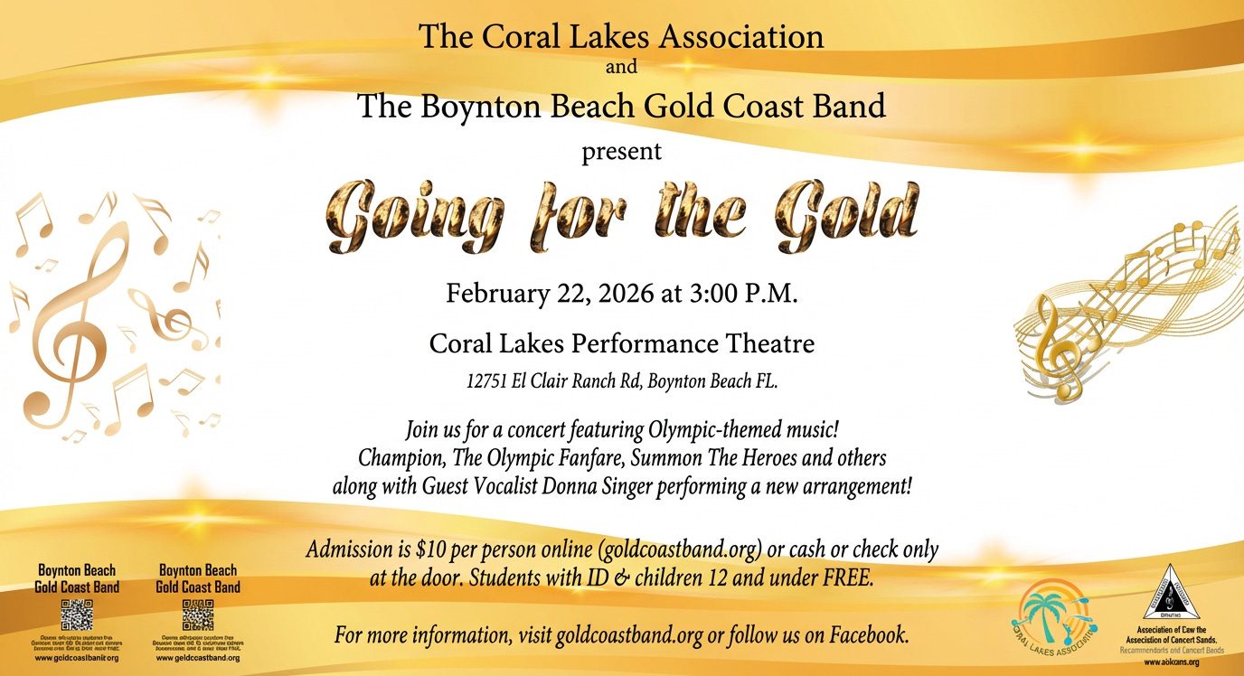 On Sunday, February 22nd at 3:00 pm, the Boynton Beach Gold Coast Band will present "Going for the Gold," a spectacular performance of iconic music with an Olympic theme. The event will be held at the Coral Lakes Performance Theatre, 12571 El Clair Ranch Road, Boynton Beach. Tickets are $10 at the door (cash or check only) or available online at www.goldcoastband.org. Children and students with school ID attend FREE.