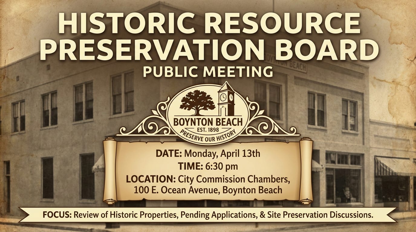 The Historic Resource Preservation Board will meet at 6:30 pm on Monday, April 13th, in the City Commission Chambers at 100 E. Ocean Avenue in Boynton Beach. The meeting will focus on the city’s historic properties, including the review of pending applications and discussions on which sites should be preserved to protect Boynton Beach’s history. For additional details, please visit the city calendar at boynton-beach.org.