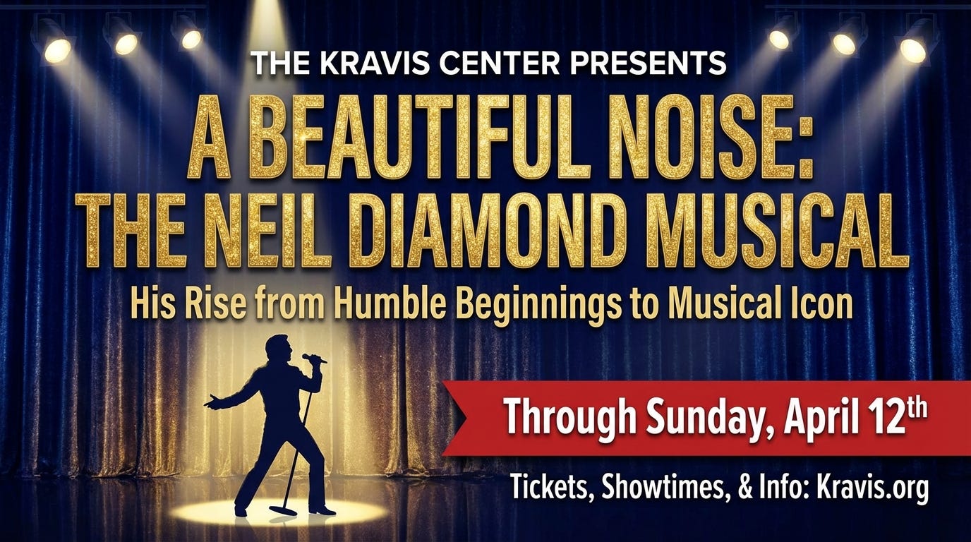 The Kravis Center is currently presenting A Beautiful Noise: The Neil Diamond Musical in its main concert hall through Sunday, April 12th. This tribute to Neil Diamond features many of his most famous songs and tells the story of his rise from humble beginnings to becoming a musical icon. Be sure to grab your tickets and enjoy the show. Visit Kravis.org for ticket prices, showtimes, parking, and additional details.