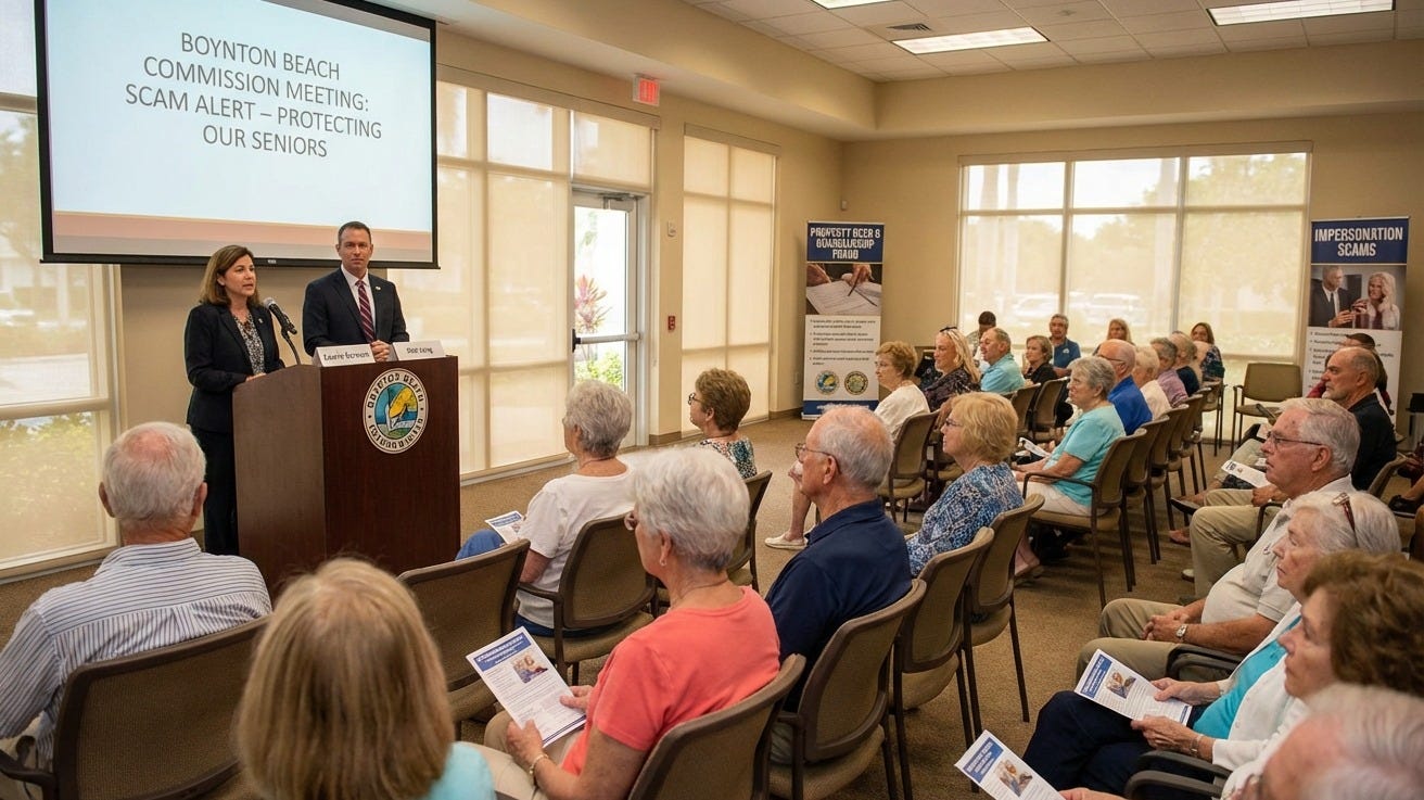 At a recent Boynton Beach City Commission meeting, officials warned residents about a surge in scams targeting the area - especially older adults. Speakers, including Laurie Berman and Rob Long, highlighted rising cases of property deed fraud, guardianship fraud, and impersonation scams, where criminals pose as police or government agencies. This matters locally because Boynton’s large 55+ population makes it a prime target, and these scams are becoming more sophisticated.