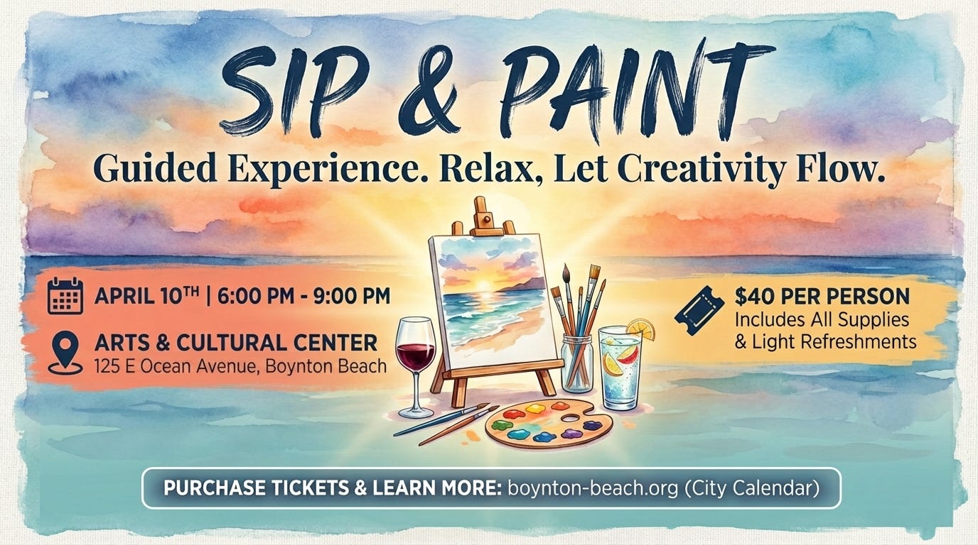 This evening, April 10th, from 6:00-9:00 pm, a Sip & Paint event will be held at the Arts & Cultural Center, located at 125 E Ocean Avenue in Boynton Beach. Enjoy a guided painting experience, relax, and let your creativity flow. Tickets are $40 and include all supplies along with light refreshments. To purchase tickets and learn more, visit the city calendar at boynton-beach.org.