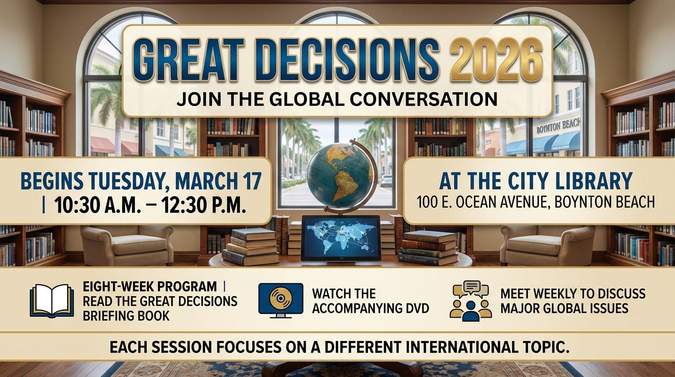 Great Decisions 2026 begins Tuesday, March 17th, from 10:30 a.m. to 12:30 p.m. at the City Library, 100 E. Ocean Avenue in Boynton Beach. Participants will take part in an eight-week program that includes reading the Great Decisions Briefing Book, watching the accompanying DVD, and meeting weekly to discuss major global issues. Each session focuses on a different international topic. To view the topics and register, visit the City of Boynton Beach calendar at boynton-beach.org or go to: https://www.boynton-beach.org/530/Great-Decisions-2026.