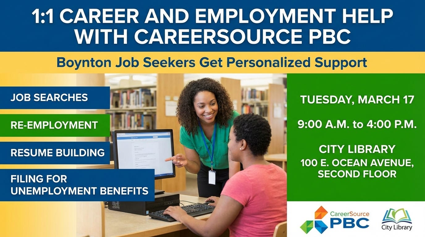 Boynton job seekers can get personalized support at 1:1 Career and Employment Help with CareerSource PBC on Tuesday, March 17th, from 9:00 a.m. to 4:00 p.m. at the City Library. Stop by the second floor at 100 E. Ocean Avenue for assistance with job searches, re-employment, resume building, and filing for unemployment benefits. For more details, visit the calendar at boynton-beach.org.