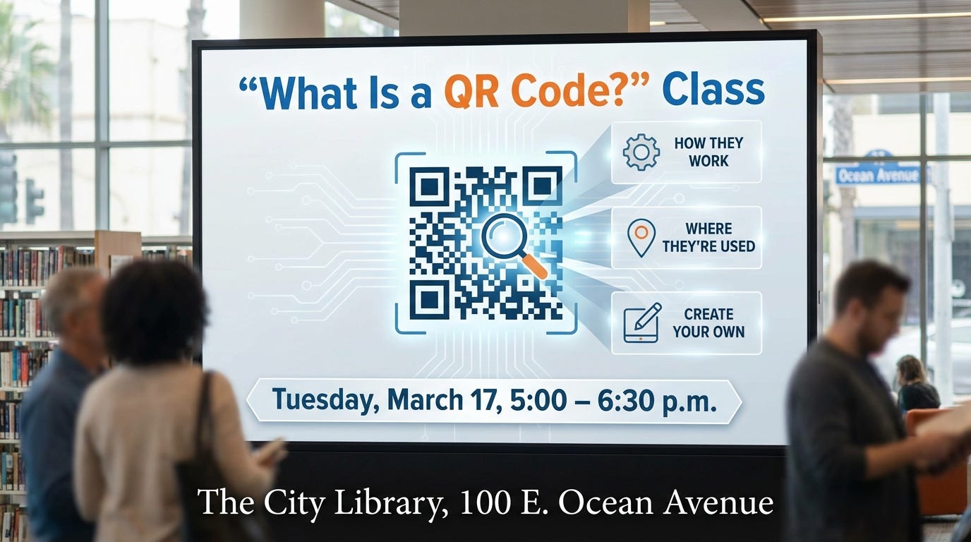 The City Library, located at 100 E. Ocean Avenue, will host a “What Is a QR Code?” class on Tuesday, March 17th, from 5:00 to 6:30 p.m. Participants will learn how these increasingly common square barcodes work, where they are used, and how to create their own. To attend, register through the calendar at boynton-beach.org.