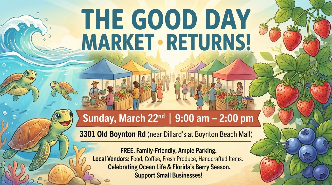 The Good Day Market returns this Sunday, March 22nd, at 3301 Old Boynton Rd, near Dillard’s at Boynton Beach Mall, from 9:00 am–2:00 pm. This FREE, family-friendly event features ample parking and a Turtle & Berries theme, celebrating ocean life and Florida’s berry season. Browse local vendors offering food, coffee, fresh produce, handcrafted items, and more. Come mingle with fellow Boynton residents and support small businesses in a relaxed, welcoming atmosphere. Visit The Good Day Market’s Facebook page here for more info.