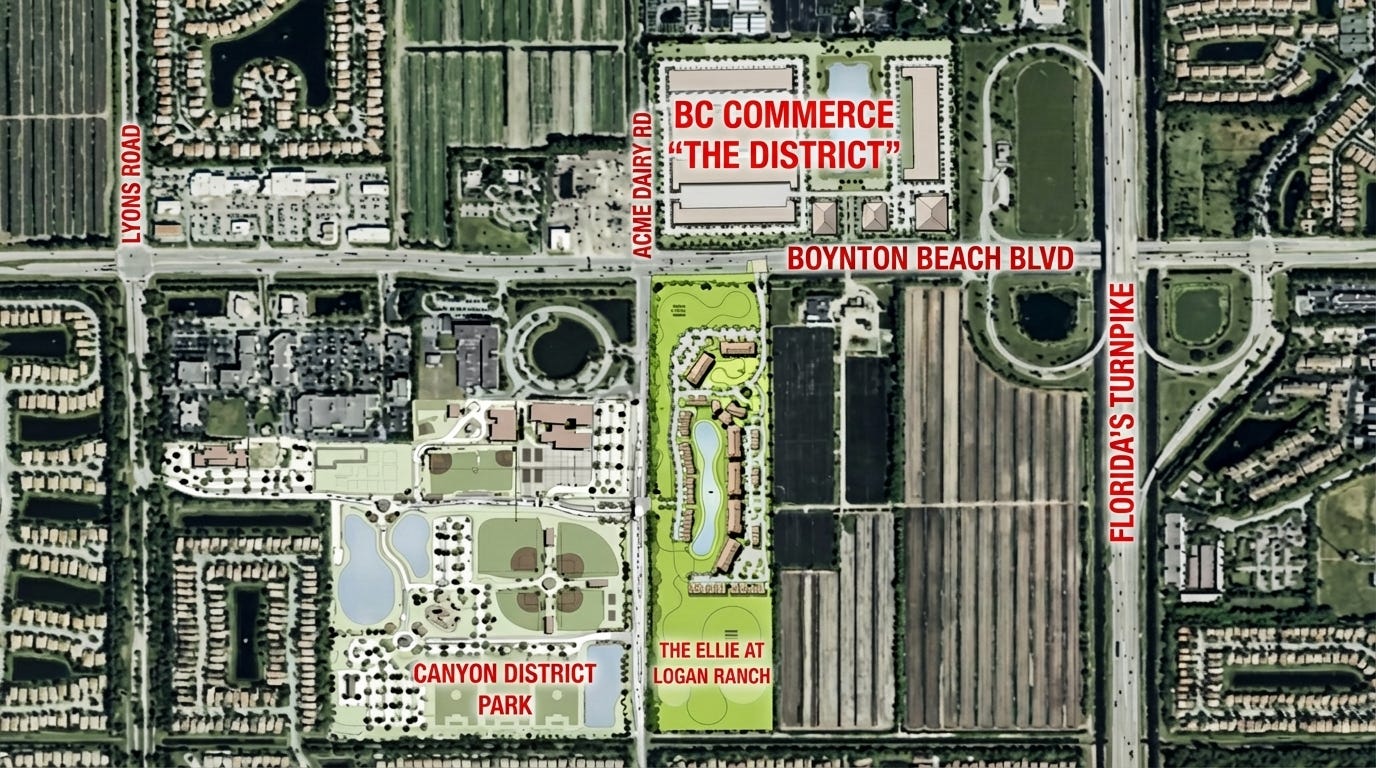 The Boynton Beach Blvd corridor between State Road 7/441 and Jog Road has seen rapid development in recent years, and a largely unknown project may soon add to that transformation. Across from The District entertainment complex sits a sprawling parcel of open land at 11275 Acme Dairy Rd - 125+ acres of former agricultural property that holds a secret most locals have never heard of. In December 2023, a 39-acre portion of that land sold for $24 million to a Scottsdale, Arizona-based LLC, a striking contrast to its original 1980 purchase price of $100. Palm Beach County approved plans back in 2023 for a development called The Ellie at Logan Ranch, which calls for 314 apartments across six four-story and seven two-story buildings, with one-to four-bedroom layouts and a portion dedicated to workforce housing.