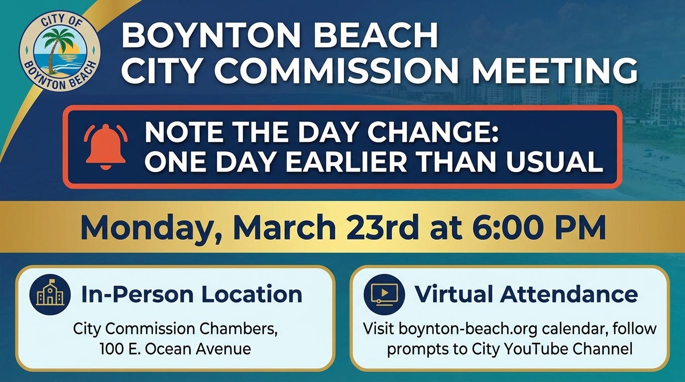The Boynton Beach City Commission Meeting takes place on Monday, March 23rd, at 6:00 PM — note the day change, as this is one day earlier than the usual scheduled meeting. The meeting will be held at City Commission Chambers, 100 E. Ocean Avenue. To attend virtually, visit the boynton-beach.org calendar and follow the prompts to access the City of Boynton Beach YouTube Channel.