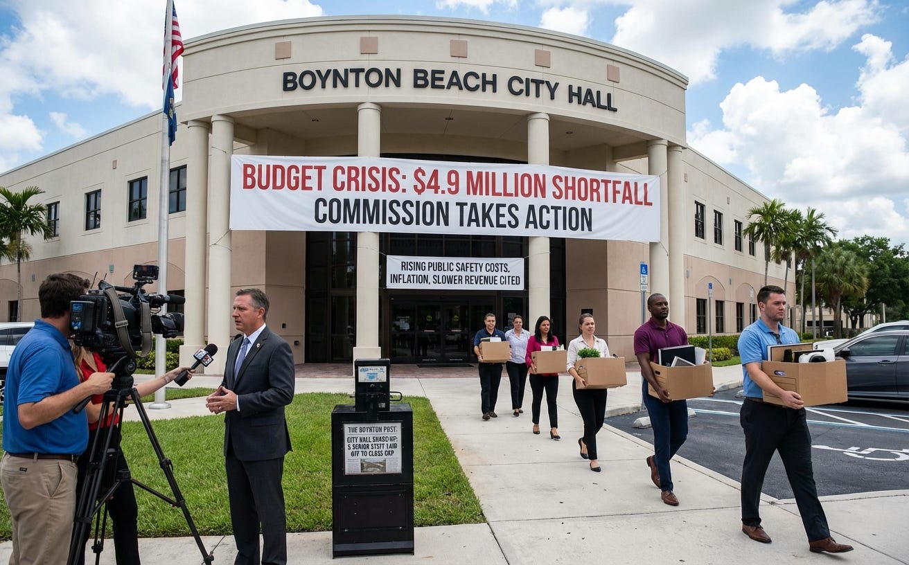 Boynton Beach is confronting a $4.9 million budget shortfall, prompting swift action at City Hall. City Manager Dan Dugger and the City Commission confirmed the deficit last week, citing rising public safety costs, inflation, and slower revenue growth as key factors. To begin closing the gap, five senior staff members - including the City Clerk and IT Director - were laid off, saving about $550,000.