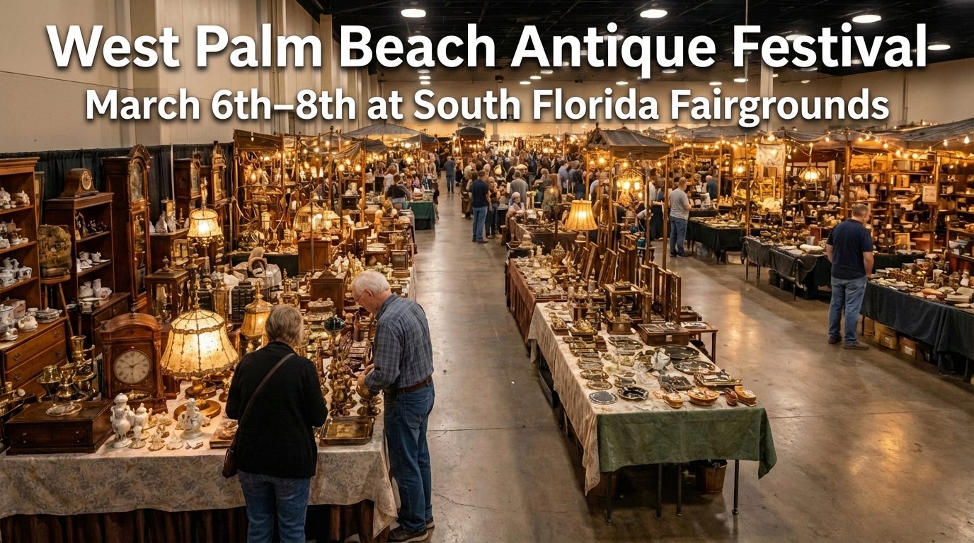 The West Palm Beach Antique Festival returns to the South Florida Fairgrounds, 9067 Southern Blvd, West Palm Beach (just west of the Florida Turnpike), March 6th–8th. Florida's largest monthly antique show features 300 vendor booths and over 120,000 square feet of collectibles, antiques, vintage items, fine art, jewelry, furnishings, and retro gifts - truly something for everyone. Visit southfloridafair.com for tickets and hours.