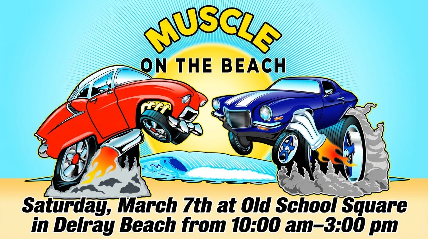 Car enthusiasts, mark your calendars! The Fourth Annual Muscle on the Beach Car Show is Saturday, March 7th at Old School Square, 51 N. Swinton Ave in Delray Beach, from 10:00 am–3:00 pm. Featuring 150+ pre-1980 American muscle cars, trucks, and hot rods, this FREE event also benefits the Sandoway Discovery Center. A great chance to relive the classics! Visit muscleonthebeach.com for more information.